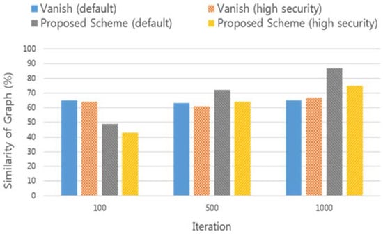 In contrast to the experimental results in Figure 12, the availability graphs of the measured data in Figure 13 shows that the similarity with the graph is relatively low. This is because the initial threshold value is different from the default parameter and the high security parameter. In general, high security parameters are used to ensure more confidential data privacy. Since the high security parameter has a strict threshold value, data availability is therefore lower than the default parameter.
