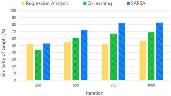 The results of the regression analysis were not significantly increased or decreased as the learning process was repeated. Q-learning and SARSA models increase in similarity to the ideal graph as the learning process is repeated. However, SARSA was found to have a higher similarity than q-learning because sufficient exploration was ensured using the following input values in the learning process.