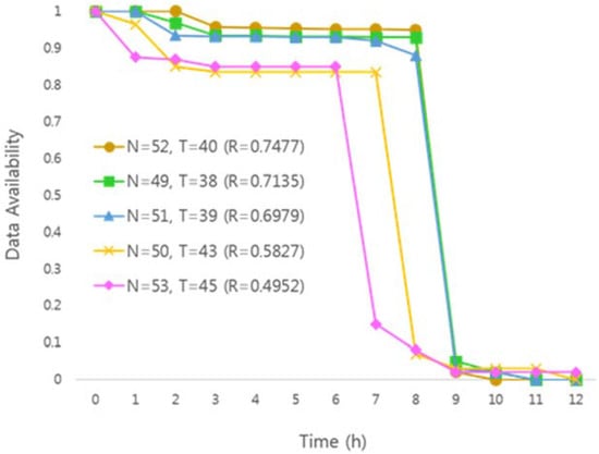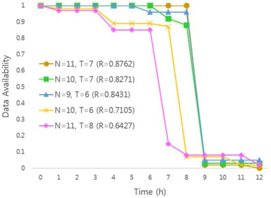 Table 5 shows the amount of data used in the environment for performance evaluation, the parameters for generating key fragments, and the measurement time. For the experiment, 1000 pieces of data were used, and each piece of data was encapsulated with a different encryption key. The key sharing parameters for generating key shares were set to have a normal distribution with a value based on the default parameters and high security parameters used in the Vanish system. Because the VuzeDHT network has a fixed timeout of 8 h, the data availability graph is measured for 12 h for each amount of data to get accurate results.