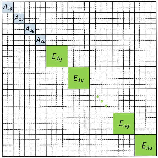 where and give the irreducible representations (irreps) of D that the basis functions, and , transform according to, and and represent their degenerate components (if present). The block diagonal structure of a Hamiltonian matrix in the D irreducible representation is given in Figure 1; the symmetry blocks of non-vanishing matrix elements can be diagonalized separately.