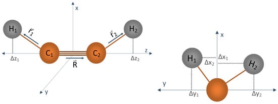 HCCH as described using the coordinates employed in TROVE. is the vector (of length R) pointing from the first to the second carbon atom, C to C, while are the two CH bond vectors (of lengths ). The , , and notation of this diagram is to reflect the Cartesian projections of the CH bond vectors.