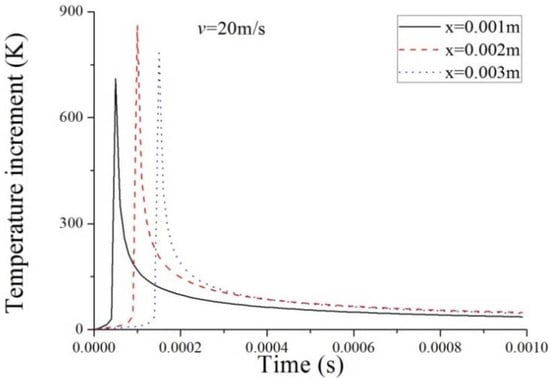 Figure 1 illustrates the variations in temperature increments on the surface of at three axial locations at the laser pulse velocity of 20 m s−1. It is shown that the temperature increment vibrates around 0 at the beginning. After some time, it increases in peak value and then drops to near zero very fast. Moreover, because of the motion of the laser pulse, it takes more time to reach the peak value of at the locations farther away from the left edge. It is clear that the peak arrives at the maximum value at the location of 0.002 m, which is equal to .