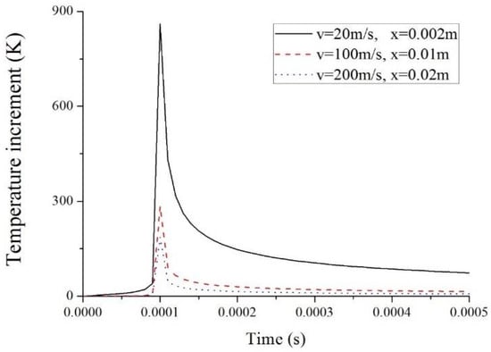 The heat propagation along the axis was obvious. The temperature increment reached a peak value at . When the laser speed decreased, the peak temperature increment increased.