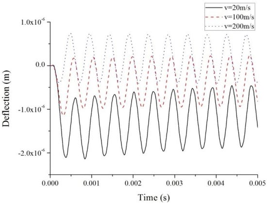 Figure 3, Figure 4, Figure 5 and Figure 6 illustrate the deflection of the beam as the motion speeds of laser pulse are 20, 100, and 200, respectively. Figure 3 shows the deflections at the midspan of the beam () for the three speeds of laser pulse. It is shown that the beam is vibrating and that the vibration behaviors are quite different for the three moving speeds of laser pulse.