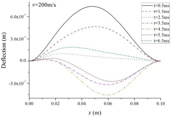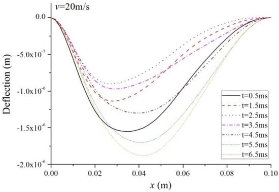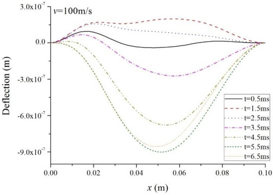 Figure 4, Figure 5 and Figure 6 show the variations of deflections along the beam span. The influence of the laser speed on the beam vibration is obvious. The vibration amplitude differs along the axis, first rising to a peak value and then dropping to 0. Moreover, the vibration mode is not symmetrical around the midspan. The zero deflection at the two edges is due to the fact that the beam is clamped. The laser pulse leads to temperatures that are higher on the left part than on the right, which indicates a non-symmetric thermal load on the beam. Consequently, the unsymmetry behavior of deflection occurs, and the peak amplitude is higher on the left part. Furthermore, when the laser pulse moves faster, both the deflection and the vibration amplitude increase.