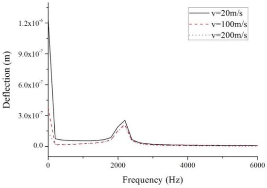 The fast Fourier transformation technique was adopted to obtain the vibration frequency. The frequency spectra for the beam at different velocities of the laser pulse are given in Figure 7. There are two frequencies: The first frequency is 0, which means the deflection takes the value of the equilibrium position of the vibration. The second one is the dynamic vibration frequency. The vibration frequencies for the three scanning velocities of the laser pulse are identical, the value being 2197.8 Hz.
