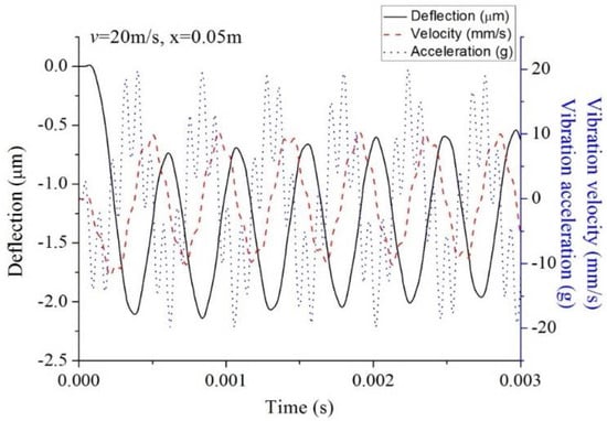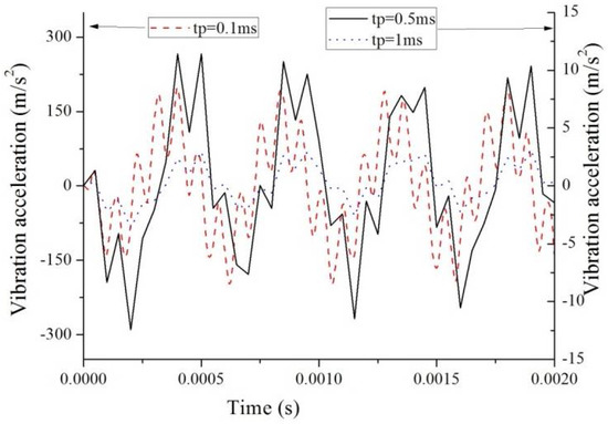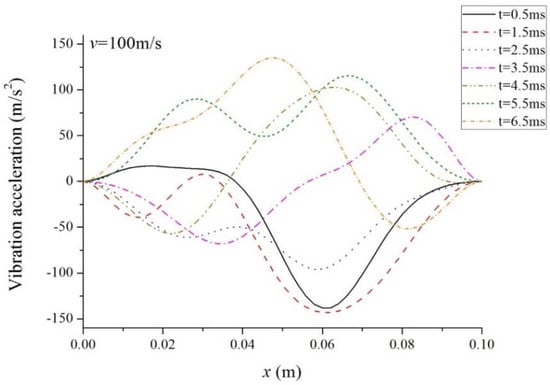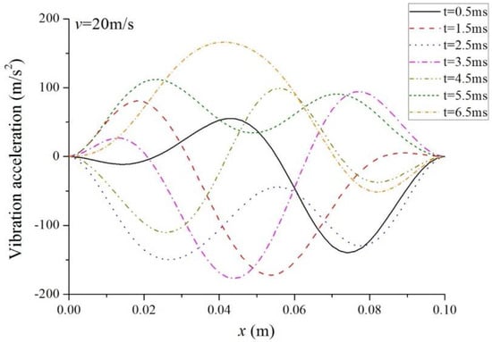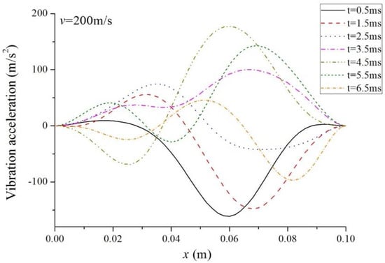 According to vibration theory, it is high-frequency vibration when the frequency is over 1000 Hz, and the acceleration is taken as the vibration criterion []. Therefore, in the following, we will study the variation in the acceleration of the beam.