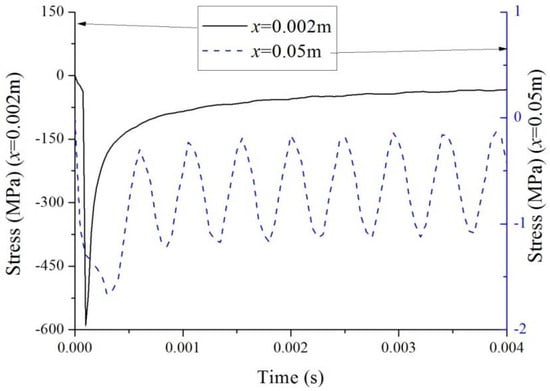 At a low laser speed (), great compression stress occurs at the location , and it drops quickly as time passes. This tendency is similar to that of temperature. However, at the midspan of the beam, the stress is much lower and it vibrates with time. In other words, the stress is determined by temperature at the beginning but depends on the deflection after a while. However, in the case of a high speed (), the temperature increment is low, so the peak value of compression stress is low. At both locations, the stresses are determined by temperature at the beginning but vibrate with small magnitudes after a while. It is interesting that the vibration amplitude of stress is higher at the midspan than at the location of . This is because the vibration acceleration at the location of is much lower than that at the midspan, which leads to a smaller impact force on the beam. Generally, the peak compression stress is higher at lower speeds. That is to say, at a low laser pulse speed, the temperature increment is dominant in the stress field; however, stress is mainly determined by the deflection of the beam at high speeds.