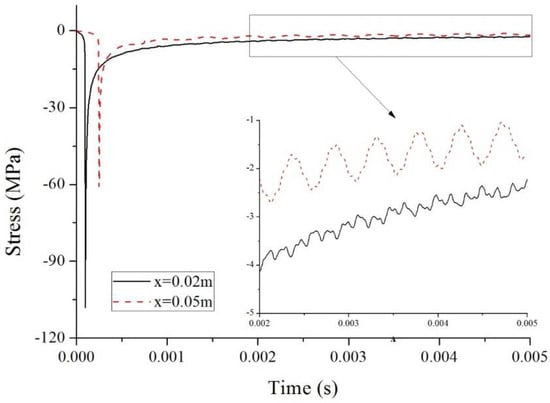The temporal distributions of stress on the top surface of the beam when the laser speeds are 20 and , respectively, are shown in Figure 12 and Figure 13. Two locations along the beam span are considered: (1) the location that has the maximum temperature, namely, ; (2) the midspan of the beam, namely, . It can be found that the stress shows quite different behaviors at these two laser speeds.