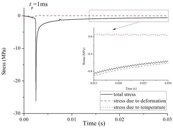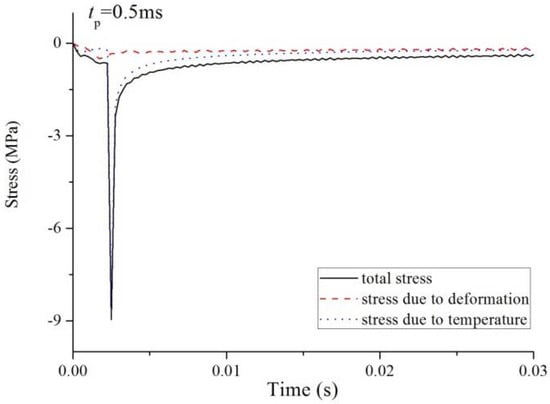 Finally, the effect of the duration time of the laser pulse, , on stress and vibration acceleration is discussed. Suppose that a laser pulse moves at a speed of . The stresses at the midspan on the top surface when takes the values of 0.1, 0.5, and 1 ms are shown in Figure 14, Figure 15 and Figure 16. Total stress and its two components, the stress induced by deformation and the stress induced by temperature increment, are also shown in these figures. The vibration accelerations in the three cases are shown in Figure 17. As increases, the magnitude of the compression stress increases, and vibration acceleration decreases. When , stress is mainly determined by temperature increment. However, in the case of , the influence of temperature increment is obvious only at the beginning of irradiation.