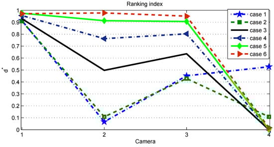 Step 4. Measure the distance between the vector defining a certain camera and the positive ideal solution. Following Equation (16), we obtain the following distances: