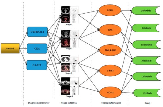 - Drug choice. Through probabilistic decision, we can calculate the different stages of NSCLC, in which several targets may exist. These targets can be used to select the method for drug treatment. Thus, we can design a decision-making method for the main chart of medication and the drug use set of data collection.