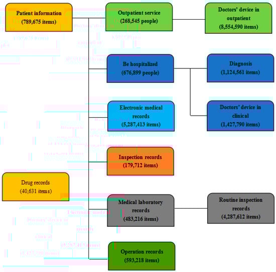 Figure 3 shows data collection in three hospitals. In 15 years, 789,675 patients were admitted to the three hospitals, and their data formed 5,287,413 valid electronic medical records. The three hospitals transmitted 1,124,561 diagnosis reports and 1,427,790 clinical diagnoses of doctors.