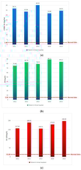Figure 4c shows patients in the analysis of CA-125 average performance in three hospitals in the recent five years. We can see that the normal range of CA-125 is between 0 and 35.0. Patients with NSCLC showed, 5 times, sampling results average performance that are larger than normal, with an average of more than CA-125. CEA indicated that the patients were in the abnormal state in recent five years with NSCLC.