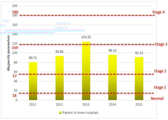According to Equation (2) calculation, we can obtain diagnosis decision-making analyses in the recent five years. In the whole process, we set three diagnostic parameters with similar weighting factors, namely . Thus, we can calculate the different decision parameters data decision values of diagnosis for patients in three hospitals.