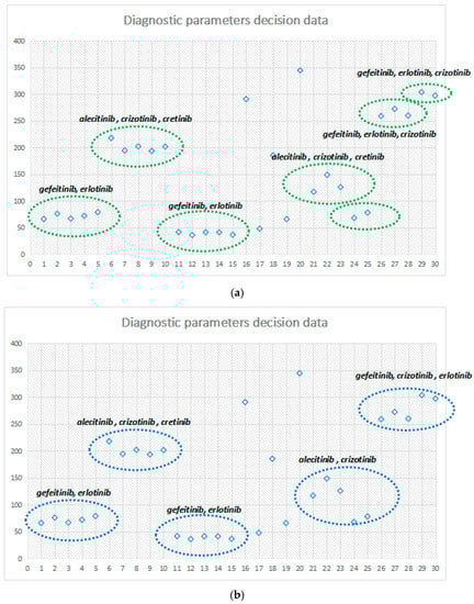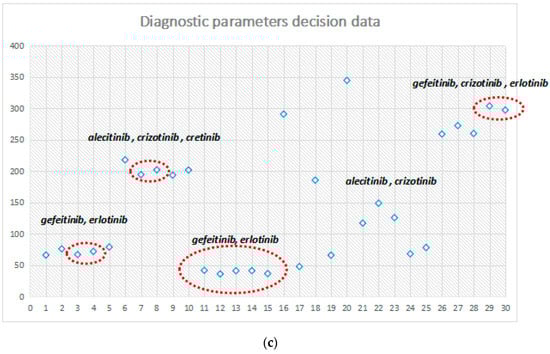 Figure 7a–c illustrate the performance under different probability parameter controls and continuous drug selection. In these figures, when , the decision node is a set of seven continuous administrations; among them, 1–5, 6–9, and 11–15 form three stages. Moreover, long continuous clinical stage of the same drug model shows the drugs that improve the stability of NSCLC. When , the decision node has five sets of drugs; then, with , the sensitivity of the system decreases with the selective reduction of decision making. When , only four drug control node sets are in a state of long-term stability between 11–15. After the adjustment for probability control parameters, the sensitivity of the system reflects the efficiency for drug decision making.