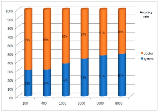 Figure 8 shows the accuracy of the diagnostic auxiliary system. From the data history, we want to know whether a patient has NSCLC or not. From this figure, the decisions by doctors are very accurately. With small samples (100–500), the accuracy reaches 97%. In big data samples (over 1000), the accuracy also reaches 88%.