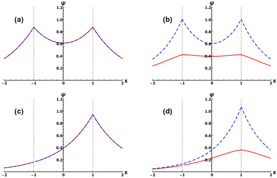 Possible solutions of (11) plotted as the wavefunctions (red, solid) as well as (blue, dashed) corresponding to the cases when: (a) both symmetries are conserved; (b) the symmetry between both cores is broken; (c) only intra-core-symmetry is broken and (d) both symmetries are broken. These wavefunctions are numerical solutions of (11) for and .