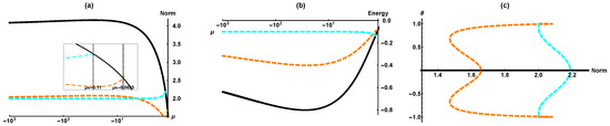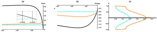 In Figure 3, we vary to the point of crossing the slanted line in Figure 2, at . This is the border line above which (unstable) states featuring the asymmetry between the cores appear, only symmetric and antisymmetric states existing below this border. These asymmetric solutions are shown by the dashed orange line. Upon further decreasing the chemical potential, we eventually enter the region where new solutions appear, with parity symmetries broken, which are represented by the blue dashed line in Figure 3. Panels (a) and (b) show the norm and energy of these states as functions of the chemical potential, while panel (c) shows the asymmetry parameters and (see Equations (12) and (13) as functions of the norm, revealing that both symmetry-breaking bifurcations are of the subcritical [33] type.