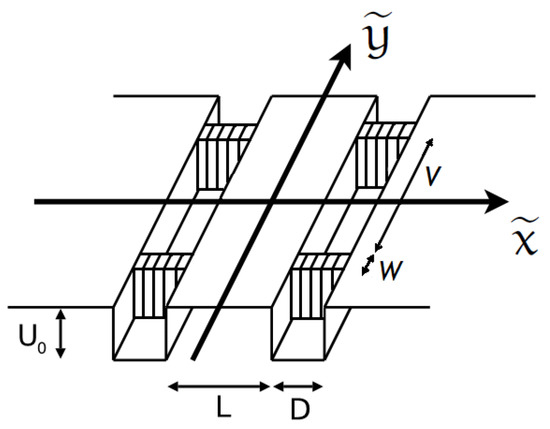 As displayed in Figure 7, potential creates the double-well (double-trough) trapping potential acting in the x direction, while nonlinearity coefficient is concentrated at four localized spots (striped in the figure). This model may be considered as a two-dimensional extension of the one-dimensional model introduced above.