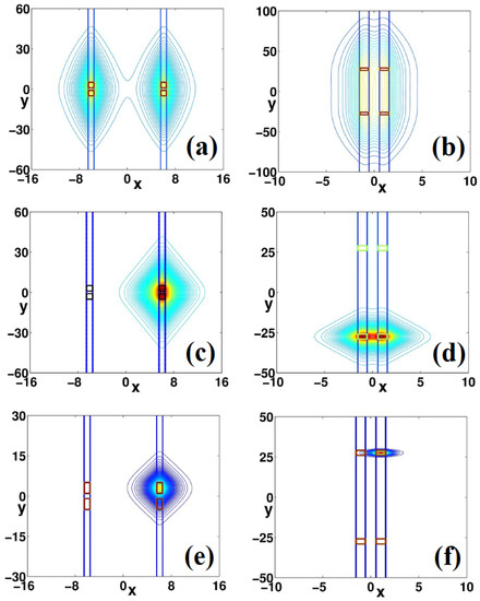 We used the imaginary-time method [47] to find ground states of the system. Their stability was then confirmed by simulating the real time evolution (using the split-step Fourier method). We have observed four types of stable solitons, which are shown in Figure 8. The figure confirms that, depending on the value of the norm, stable states with all possible combinations of the asymmetry can be produced. A general conclusion, suggested by the systematic simulations, is that, in the model with weaker coupling between the cores, it is easier to find stable states with the broken symmetry between the cores. With the increase of the norm, states with both symmetries broken are found too. On the other hand, the symmetry between the nonlinearity-concentration spots in both cores in broken first (in the setting with the nonlinearity spots) is set closer to each other. In particular, values of parameters in Figure 8 are: in Figure 8a,c,e, , , , , and the norm in the increasing order, , , and , respectively. Similarly, in Figure 8b,d,f, the parameters are , , , , and norms are, respectively, , 4, and . The depth of linear potential and the (constant) value of the nonlinear coupling can be rescaled. The strength of the interaction is now contained in the norm of the wavefunction.