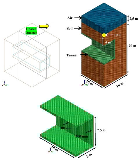 A box-shaped railway underground tunnel with 500 mm lining thickness for the roof and wall constructed in Spain at a depth of 4 m with a height of 7.5 m and width of 10 m was modelled []. A quarter of the field with dimensions of (25 × 25 × 30) m was modelled, according to the Alekseenko test, owing to the symmetry of the YZ and YX planes []. However, at dimensions of (10 × 10 × 22.5) m, a comparable behaviour as the Alekseenko test field appeared, and, consequently, these dimensions were used in the current research to decrease the computational cost and time, as described in Figure 1. The tunnel was placed into sandy soil that was directly beneath the explosion centre, which is considered as the most critical position according to [,]. The soil, air, and tunnel parts were modelled by using a solid (164) element, which is considered as the most widely used element in explicit analyses, and which could be only defined by using eight nodes []. The blast load was defined by using the (Initial_Volume_Fraction_Geometry) available in LS-Dyna as a spherical shape by specifying its radius and detonation point []. The surface detonation occurred by using a container truck carrying a 4536 kg TNT charge weight, which is considered as the most critical condition, as stated by [].