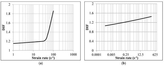 Material 16 (MAT_Pseudo_Tensor) was utilized to model the tunnel structure. It is suited to simulate the underground reinforced concrete structures that were subjected to blast loadings []. An automatic internal generation of a simple “generic” model for concrete can be achieved by inserting a negative value for A0 equal to −145, so that a trilinear equation of state (EOS) Type 8 will be automatically created from the unconfined compressive strength () and the Poisson ratio (Pr). The maximum principal stress for failure (SIGF) [] is assumed to be the fc and is equal to 61.18 MPa. A smeared modelling option available in Material 16 was used to simulate the rebar due to a large number of model elements, as well as its ability to deliver reasonable results within lower cost and time than that needed by discrete models []. Strain rate sensitivity was defined for the concrete and rebar by using dynamic increase factor (DIF) curves, as shown in Figure 2. The DIF curve was obtained during a laboratory test conducted in UKM University on concrete with a compressive strength of 61.18 MPa via the split Hopkinson pressure bar (SHPB) impact test within a strain rate range of up to 103.87 s–1 []. For steel, the DIF of grade 60 rebar was determined by using Malvar‘s equation []. Table 4 shows the tunnel parameters, where SIGF is the unconfined concrete compressive strength (fc), Pr is the Poisson ratio of concrete, Er is the elastic modulus of steel, PEr is the reinforcement percentage, PRr is the Poisson ratio of steel, and SIGY is the steel yield stress ().