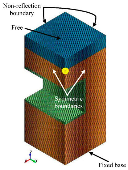A non-reflection boundary condition was used to the infinity domain to reduce the stress wave reflection. On the other hand, the motion of the nodes normal to the symmetry planes XZ and YZ were fixed. The upper surface was free, while the base was assumed as a rock bed and was fixed in all directions, as shown in Figure 3 [].