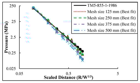 Initially, the numerical model was created without the tunnel structure in order to monitor the transmission of blast shock waves into the soil during the explosion of a container truck. A convergence study was conducted via using meshes with element sizes of 125, 250, 375, and 500 mm. The outcomes of this study were compared with the results of the empirical equation that was provided by technical manual (TM5-855-1) to estimate the peak pressure values inside soil during a blast surface explosion, as follows []: