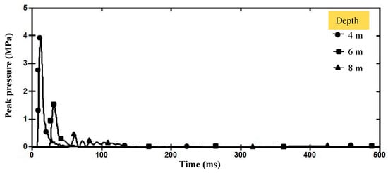 Figure 5 appears the behaviour of the blast waves into the soil in term of pressure at different depths under the explosion centre of a container truck. It is proved that the distance and time from the blast centre could considerably decrease the pressure of blast waves by 853.83% at a burial depth of 8 m as compared to 4 m due to the dissipation of the blast waves into the sandy loam soil [].
