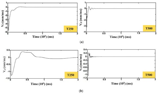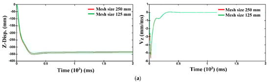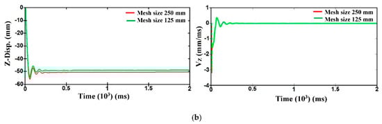 The outcomes revealed that the mesh size of 250 mm could efficiently estimate the dynamic response of the tunnel as in cases of lining thicknesses of 250 and 500 mm within differences less than 2.17 and 2.96% in terms of displacement, as well as, 8.22 and 7.32% in terms of velocity, respectively, as compared with a mesh size of 125 mm, as shown in Figure 7. Therefore, the mesh size of 250 mm was used to simulate the models of the present study to reduce the computational time, except the tunnel with 250 mm lining thickness, which was modelled by a mesh size of 125 mm to accurately represent the response of the tunnel, particularly in terms of failure. The prior studies proved that element sizes of 250 and 500 mm were capable of precise analysis of the three-dimensional model of the tunnel under a surface blast loading [,].