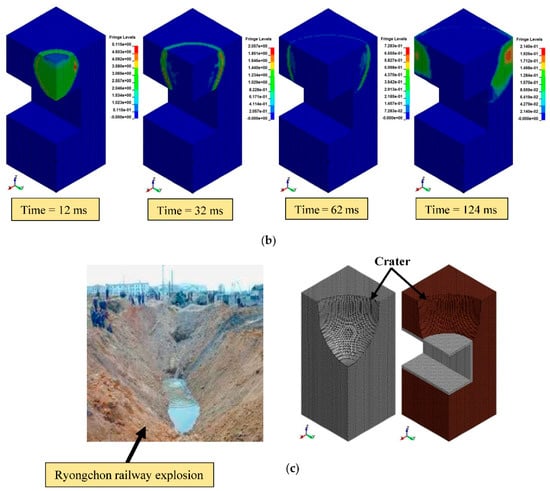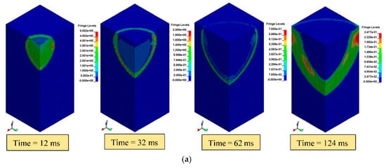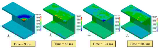 The values of peak pressure into the soil were almost identical and its contours determined at different interval times of 12, 32, 62, and 124 ms before and after inserting the tunnel structure. The chosen time intervals corresponded to the values of peak incident pressure into the soil at depths of 4, 6, 8, and 10 m, respectively. The pressure response at a depth of 4 m was started at 7 ms and its maximum value was 3.98 MPa, which was recorded after 12 ms. Obviously, the main difference between the two cases is the affected region in the soil. The existence of the tunnel structure in the soil prevents the blast-induced waves from migrating to a deeper soil layer by reflecting the incident pressure. In addition, the results of pressure contours revealed that the explosion waves were travelled into the sandy soil in a hemispherical shape before and after inserting the tunnel structure, as shown in Figure 8. Its area was considerably increased with the wave propagation and results in a crater, which obviously matches the remarked phenomenon during the blast of the Ryongchon railway station in North Korea [].