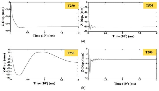 With the increase of burial depth, the lining thickness of 500 mm was able to resist a container explosion at burial depth of 6 m within a low damage level boundary condition. Once again, the burial depth of the tunnel was capable of reducing the lateral displacement of roof centre from 352.18 and 56.02 mm to 122.29 and 10.32 mm for lining thicknesses of 250 and 500 mm, respectively, as shown in Figure 11. Similar effect of burial depth on the tunnel safety was observed by several scholars [,]. Mussa et al. [] revealed that the box-shaped tunnels with lining thicknesses of 250 and 500 mm collapsed at burial depths of 4 and 6 m, respectively. This observation may be attributed to the material model that was used in the study that neglected the strain rate sensitivity of concrete and rebar.