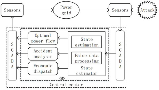 The system model of the smart grid is shown in Figure 1 [19]. First, the sensors transfer the real-time information of each node to the supervisory control and data acquisition (SCADA) system through the network. The SCADA system then transmits these measurements to the state estimator in the energy management system (EMS). The state estimator contains state estimation module and false data processing module [20]. The state estimation module is used to estimate the state of the smart grid, and the false data processing module is used to detect the measurement data. Through these two modules, when the real-time measurement data contains measurement or transmission errors, these can be detected [21]. The estimation results will be applied to control the operation of smart grid, such as optimal power flow, accident analysis, and economic dispatch. The control center makes decisions according to the real-time state of the system, which can affect the operation of the smart grid.