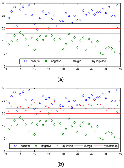For the convenience of description, we draw a specific diagram of the SVM when the data in the training set is two-dimensional. For example, when the data is two-dimensional, the basic situation of training set and SVM classification without attack are shown in Figure 2a.