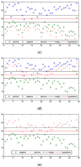The training set of SVM. (a) The normal classification of SVM; (b) Centralized injection; (c) Injecting data into the negative sample space; (d) Identically distributed injection; (e) Training set update. In these pictures, the blue circles represent positive examples, the green diamonds represent counterexamples, the red crosses represent the injected data, the black lines represent the boundaries of margin, and the red line represents the hyperplane.