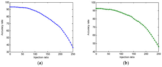 The results of the experiment are as shown in Figure 3 and Figure 4. In Figure 3, the horizontal axis represents the amount of FDI, and the values on the horizontal axis represent the percentage of the training set. The longitudinal axis represents the accuracy of the detection result obtained by the detector detecting the test set, and the unit of the value is the percentage. The value of the horizontal axis can exceed 100% because the injection process should not end when the data of the initial training set is completely updated. As the injection process continues, the update of the training set is continuing, as well as replacing the oldest data in the training set.