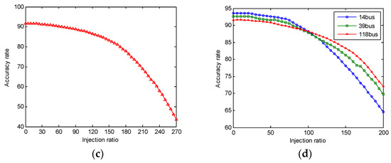 Figure 3a–c respectively describe the amount of FDI when the accuracy is reduced to 50% in the three simulation environments. In the IEEE-14bus system, when the amount of FDI reaches 230%, the accuracy of detection result for test set is reduced to less than 50%, which is 49.83%. In the IEEE-39bus system, the amount of FDI is slightly increased, which needs to be 245%, and the accuracy is 49.04%. In the IEEE-118bus system, the amount of FDI needs to reach 260%, and the accuracy is 48.86%. It is obvious that when the number of nodes increases, the number of FDI attacks will be increased in order to achieve the same attack effect. There are two main reasons. On the one hand, with the increase of the number of nodes, the dimension of the data in the training set will be increased, which, to a certain extent, will reduce the effect on the training results when attackers inject the same amount of false data. On the other hand, because of the number of nodes is increasing, the relationship between the nodes will limit the generation range of constructing the attack vectors, and the distance between attack vectors and normal data will decrease, which will then reduce the impact on training results.