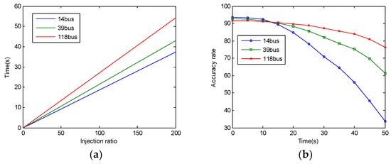 Figure 3d depicts the comparison of the different reactions among the three simulation environments during the injection from 0 to 200%. This figure shows that the difficulty level of the attack increases when the nodes increase. When the injection ratio is lower than 20%, the accuracy rate does not decrease significantly and is basically at the same level. The attack may have no effect on the system. Unfortunately, after the injection ratio reaches 50%, the accuracy rate will decrease obviously with the injection ratio increasing. The results cannot change completely even though the simulation environment changes. Figure 4a describes the relationship between the amount of FDI and time. In the process of the experiment, it was found that the amount of FDI was basically linear with time. When the amount of FDI is 200%, the time spent by three systems was recorded. In the IEEE-14bus system, it is 37.274 s; in the IEEE-39bus system, it is 43.016 s; in the IEEE-118bus system, it is 54.218 s. As the nodes increase, the dimensions of the training set are also increased, and the training time of SVM will increase. Figure 4a shows the effect this produces. Figure 4b describes the relationship between attack time and attack effect (accuracy). Because the cache capacity is 5% of the training set, it is difficult to guarantee that the update time is just the entire number of seconds. The accuracy rate in this picture is the accuracy of the latest update whose occurrence time is the most near the entire number of seconds. When the time reaches 50 s, the accuracy of 14bus system is only 33.74%, while the accuracy of 118bus system is still at a high level, which is 76.35%. The results show that the attacking time increases when the number of nodes increases.
