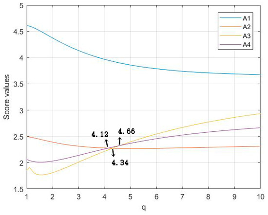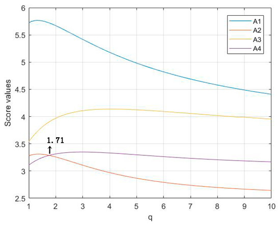 The parameters q, s and t play significant roles in the final ranking results. In the following, we shall investigate the influence of the parameters on the overall assessments of alternatives and the final ranking results. First, we discuss the effects of the parameter q on the ranking results (suppose s = t = 1). Details are presented in Figure 1 and Figure 2.