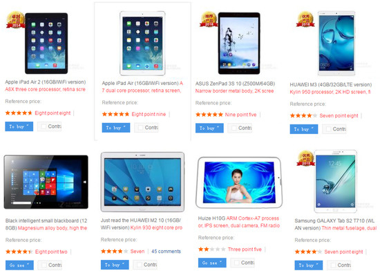 By limiting the brand, basic function and price of tablet computers, five alternative tablet computers were initially screened by the consumer on ZOL website. The consumer needs to select a desirable tablet computer from the following five alternative tablet computers.