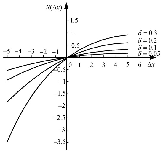 where is the deviation of consequence between and , is the regret aversion parameter, and the larger is, the greater regret aversion degree of the decision maker is. is the regret–rejoice value under the situation for choosing instead of . The regret–rejoice function with different regret aversion parameter is shown as Figure 2.