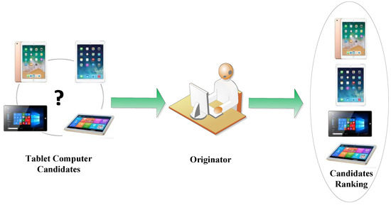 With the advent of the era of big data, trading on e-commerce platforms develops rapidly [1,2]. Consumers can effectively access product information and make purchase transactions on an e-commerce platform without the restriction of time [3,4,5]. For most consumers, the choice of purchasing product is related to the joy of product experience. With the help of the e-commerce platform, consumers can identify products based on their specific demands and then seek desirable ones. Nowadays, many e-commerce websites, e.g., Amazon (https://www.amazon.cn/), Zol.com.cn (http://www.zol.com.cn/), JD.com (https://www.jd.com/) and Taobao.com (https://www.taobao.com/) have provided platforms for consumers to select their products and share their online ratings or reviews on product experience. For instance, if a consumer wants to purchase a tablet computer due to occupational demand, before purchasing, he/she can browse an overall recommendation of tablet computers via Zol.com.cn which is an IT and business portal. Furthermore, e-commerce sites, such as Zol.com.cn, allow consumers who have already purchased tablet computers to post their personal evaluations publicly online, so that other consumers can get helpful references from these websites. Figure 1 shows a list of tablet computers from Zol.com.cn (http://detail.zol.com.cn/tablepc/good_pic.html). Therefore, it is of great significant to explore the product selection problem oriented on online ratings and reviews in e-commerce platform.