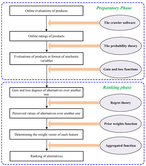 To solve the above decision-making problem, a resolution process of selecting products is proposed as shown in Figure 4. In Figure 4, the resolution process can be divided into two parts: (1) preparatory phase, i.e. crawling the related online ratings data and constructing the stochastic evaluations of products; and (2) ranking phase, i.e. considering the behavior of the consumer, a ranking method for products is proposed. A brief illustration of each part is given below.
