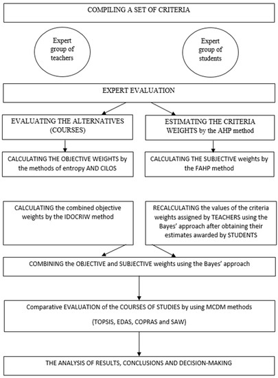 The research procedure is presented in Figure 1, including combination of criteria weights calculated by applying different methods and evaluation of courses by using four MCDM methods.