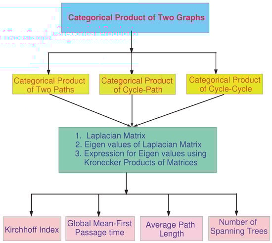 These results are indirectly related to entropy. Using the same spectra, we have future plans to compute the global first-passage time for maximal-entropy random walks in categorical product networks, and the categorical product network entropy is also in our future plans using the idea given in [,].
