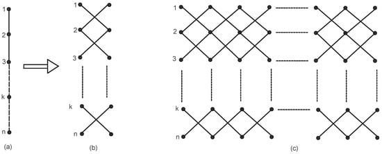 Let a categorical product network of paths be constructed in an iterative way. We take categorical product network , after iterations. Initially at is a path with n vertices. For , is constructed from ; from every existing vertex in , a new vertex is created so that a new path with n vertices is constructed; also, each new vertex in is connected to the vertices in , shown by Figure 2. The number of vertices and edges in is and , .