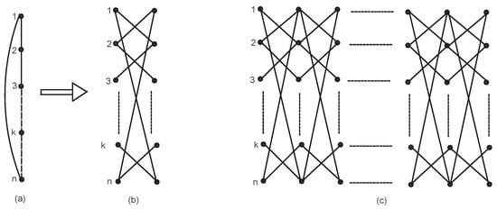 Let a categorical product network of the cycle and path be constructed in an iterative way. We take the initial categorical product network , () after iterations. Initially, at is a cycle with n vertices. For , is constructed from , from every existing vertex in , a new vertex is created so that a new path with n vertices is constructed; also, each new vertex in is connected to vertices in , shown by Figure 3. The number of vertices and edges in are and , .