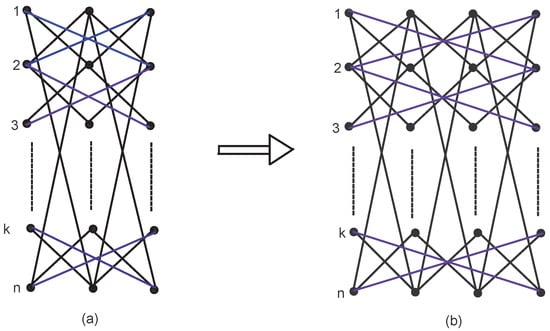 Let a categorical product network of cycles be constructed in an iterative way. We take initial categorical product network , () after iterations. Initially, at is a categorical product network of cycle with n vertices. For , is constructed from , and from every existing vertex in , a new vertex is created so that n vertices are constructed; also, each new vertex in is connected to the vertices in , shown by Figure 4. The number of vertices and edges in are and .