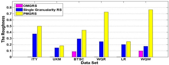 We can draw a histogram Figure 1 based on the results of the roughness in Table 3. As illustrated in Figure 1, the roughness of three rough set models is increasing in each data set according to the order of OMGRS, Single Granularity RS, and PMGRS. Where the roughness in OMGRS is the smallest, the roughness in PMGRS is the largest and the roughness in Single Granularity RS falls in between the roughness in OMGRS and the roughness in PMGRS in each data set, which show the concept become increasingly rough in the light of the order of OMGRS, Single Granularity RS, and PMGRS.